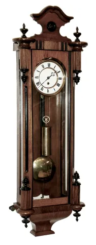 Vienna regulator, eight days, time only, single brass, weight driven movement in a walnut case with ebonized highlights and white enamel dial, serial number 32573, c1875 the case retains some of its original finish. The dial has a hairline through the center. Dial, movement and bracket has matching serial No. Õs. The lower finial is absent. Ht 32Ó