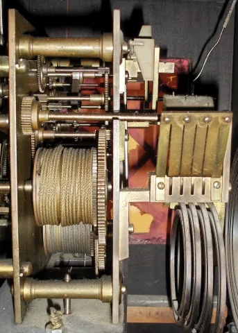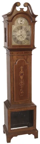 the case retains its original finish and the panel in the lower plinth, the fret work panel on the right of hood and the top finial are absent. The si...
