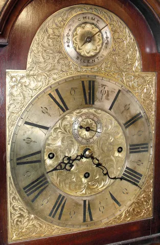 Germany, unsigned tall case clock, 8 days, time, strike and chime, three, weight driven movement in an inlaid mahogany case with a brass dial and silvered chapter ring with a chime / silent selector, c1890