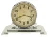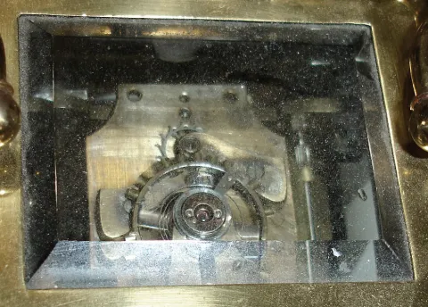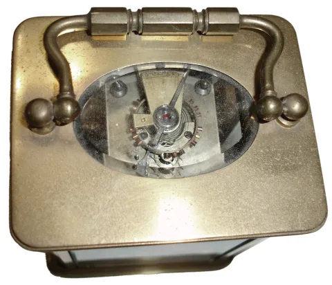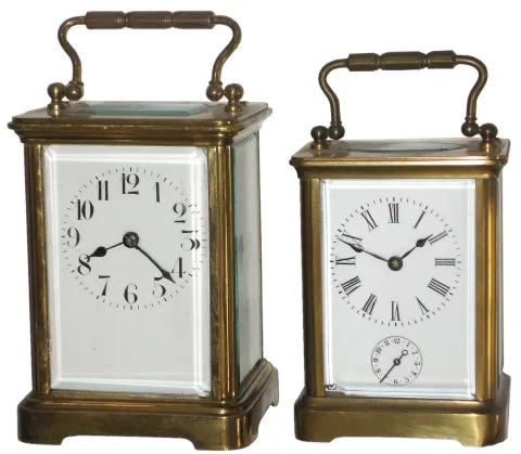 Clocks- 3 (Three) French carriage clocks, 8 days, brass and beveled glass, white porcelain dials, old lever escapement platforms; larger is time and strike; smaller is time and alarm; c1910, together with a Waltham Art Deco style double side desk clock and a Morbier movement both cases are in nice condition with slightly worn surfaces. A few of the glasses have corner chips and one is cracked. The smaller clockÕs dial has a diagonal hairline at the top. Both clocks tick briskly and the striker strikes, but they were not tested long term. Hts to handle tops 6Ó and 5 1/2Ò, Waltham running, minor losses to plating
