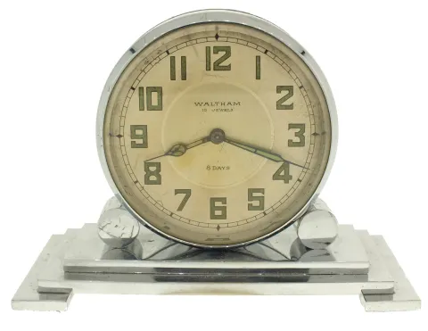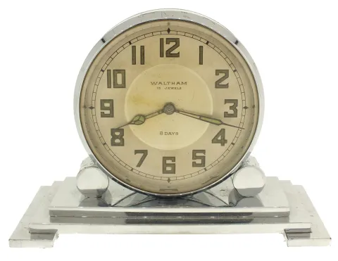 both cases are in nice condition with slightly worn surfaces. A few of the glasses have corner chips and one is cracked. The smaller clockÕs dial has a diagonal hairline at the top. Both clocks tick briskly and the striker strikes, but they were not tested long term. Hts to handle tops 6Ó and 5 1/2Ò, Waltham running, minor losses to plating