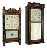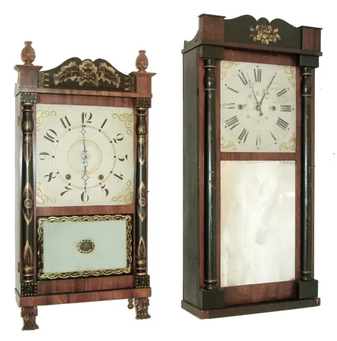(1) Mahogany veneered case in nice condition in an old finish. Stenciling on the columns are probably original, but the stencils on the splat are modern. Original painted dial is very nice for its age. Hands are probably replacements, but proper style. Period carved pineapple finials. Bottom tablet glass is original with only remains of original gilt border, the rest sprayed with blue paint. Nice label inside the case. (2) Mahogany veneered case in original finish with some veneer loss on the base and the right lower block. Original wood dial with wear and scattered paint loss. Original hands. Stenciling on the columns is original, but worn. Stenciling on splat is not original. Mirror is replaced. Nice label inside the case.