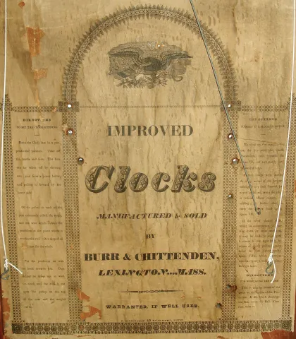 Clocks- 2 (Two): (1) E. & G. W. Bartholomew, Bristol, Conn., 30 hours, time and strike, weight wood movement half column & splat shelf clock, c132. (2) Burr & Chittenden, Lexington, Mass., 30 hours, time and strike, weight wood movement half column & splat shelf clock with ÓgroanerÒ movement, c135. (1) Mahogany veneered case in nice condition in an old finish. Stenciling on the columns are probably original, but the stencils on the splat are modern. Original painted dial is very nice for its age. Hands are probably replacements, but proper style. Period carved pineapple finials. Bottom tablet glass is original with only remains of original gilt border, the rest sprayed with blue paint. Nice label inside the case. (2) Mahogany veneered case in original finish with some veneer loss on the base and the right lower block. Original wood dial with wear and scattered paint loss. Original hands. Stenciling on the columns is original, but worn. Stenciling on splat is not original. Mirror is replaced. Nice label inside the case.
