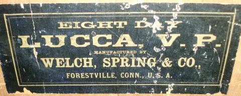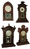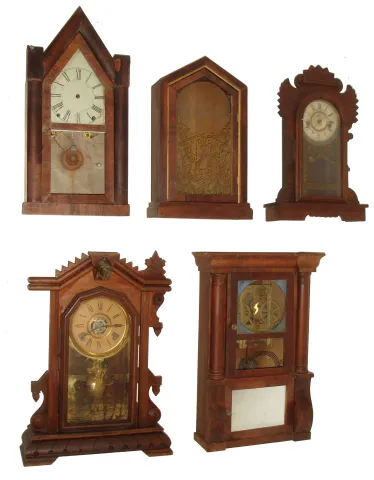 Clocks- 9 (Nine): (1) Welch, Spring & Co., Bristol, Conn., ÒLucca, V.P.Ó, 8 days, time and strike, rosewood veneered shelf clock case, c1880 (2) Waterbury Clock Co., Waterbury, Conn., 8 days, time and strike, carved walnut shelf clock, c1875 (3) E. Ingraham Co., Bristol, Conn., 8 days, time and strike, walnut shelf clock. (4) Chauncey Jerome, New Haven, Conn., 8 days, time and strike, round gothic or beehive shelf clock, c1850. (5) E. O. Goodwin, Bristol, Conn., 8 days, time and strike, small column & cornice shelf clock, c1850. (6) Waterbury Clock Co. Waterbury, Conn., ÒCoronaÓ model 30 hours, time and strike, small size mantel clock, c1890. (7) Unknown, arch top clock case (only), c1880 (8) Terry & Andrews, Bristol, Conn., 8 days, time and strike, sharp gothic or steeple clock, c1850. (9) E. Ingraham & Co., Bristol, Conn., for 8 days, time. strike and alarm, walnut shelf clock probably made for C. F. Adams, Erie, PA, c1900. (1) Rosewood veneered case in original finish with a veneer repair to the block just above the drop. Period painted dial with wear and minor loss. Dial and movement may not be original to this case as there are extra holes under the dial and the movement would need to be mounted on blocks to bring in forward enough to pass throw the dial. Tablet is a replacement. Pendulum is correct, but finials are replaced and too small. Nice label on the back of the case. (2) Refinished walnut case. The side corners on the top molding appear to be missing. Original paper dial is stained and worn. Center area of the dial is missing. Pendulum, gong and base, and hands are missing. Tablet maybe a replacement. (3) Walnut case has lost its original finish. Paper dial has been replaced. Hands are replacement. Tablet looks to be original. Original pendulum. (4) Mahogany veneered case has lost its finish and has repairs on the base. Painted dial looks to be original with some loss. Hands and pendulum are missing and upper round part of the door is missing. Original frosted glass is cracked. (5) Mahogany veneered with minor veneer loss on the cornice and repairs on the base. Original dial glass with some loss. Movement is signed ÒBrewster & IngrahamsÓ. There is no dial, hands, verge or pendulum. Mirror is a replacement. Center glass is missing. (6) Stripped walnut case. Original dial is soiled and worn. Hands, pendulum, gong base and gong are missing. (7) Stripped rosewood veneered case. Tablet looks to be original. (8) Stripped rosewood veneered case with some loss and repairs on the base. Period painted dial has been redrilled for the movement in this case. There are no hands, pendulum, gong or lower tablet. Finials are missing. (9) Walnut case in original finish. One of the side pieces is missing. Original paper dial has age darkened. Original hands and pendulum and tablet. Remains of a label in the bottom of the case.