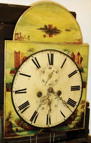 Scottish tall clock, 8 days, time and strike, weight driven, brass movement in a mahogany and mahogany veneer case with string and diamond inlay, crotch mahogany door and base and a painted iron dial and date calendar, c1840 the case has been refinished and the bracket base is a replacement. The broken arch top has restorations. The finial is a replacement. The dial has some bleeding on upper section of chapter ring but is otherwise very attractive with a scene of Lochleven / Kenross castles and waterfalls. Ht 90Ò