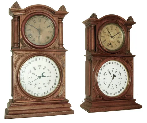 Clocks- 2 (Two): (1) E. Ingraham & Co., Bristol, Conn., ÓIngraham CalendarÒ shelf clock with spring driven, 8 days, time & strike movement in a walnut case, c1881. (2) E. Ingraham & Co., Bristol, Conn., ÓIngraham CalendarÒ shelf clock with spring driven, 8 days, time (only) movement in a walnut case, c1881. (1) Most of the case finish is gone. The top case molding is missing. The upper paper dial has darkened considerably. The columns on the upper portion of the case are loose. The B.B. Lewis calendar mechanism, dial and all hands are correct. The linkage from the time movement to the calendar mechanism needs to be restored. Ht 21 1/2Ó. (2) The case finish is worn fairly thin. The top case molding is missing. The upper paper dial has darkened considerably. The B.B. Lewis calendar mechanism, dial and all hands are correct. The linkage from the time movement to the calendar mechanism needs to be restored. Ht 21 1/2Ò.