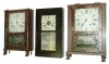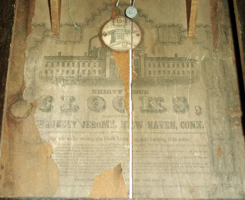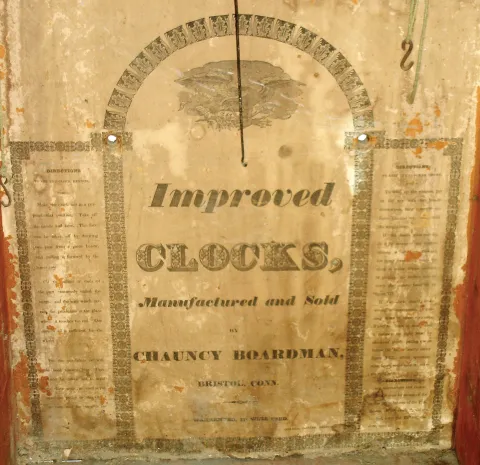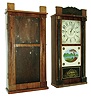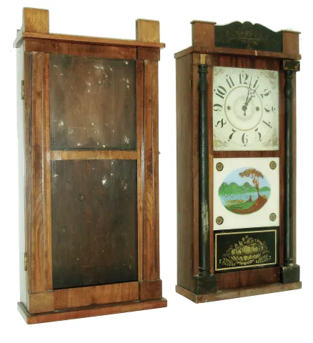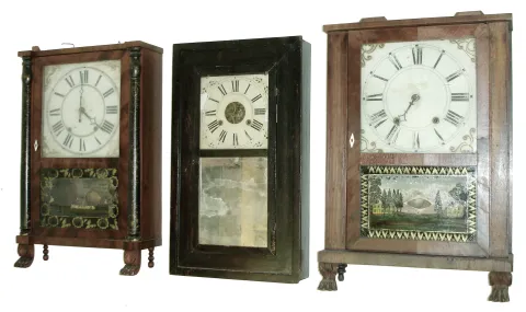 (1) Refinished mahogany case with splat missing; painted wooden dial in nice condition; original hands; original top glass; original painted tablet with significant loss in center; Carved feet may be earlier replacements; no weights; (2) Mahogany case with missing splat, chimneys, returns and half columns Painted wood dial in fair condition. Minute hand missing; Top glass original; Tablet original with significant flaking; (3) Mahogany case in fair condition; appears to have been a wooden movement clock; (4) Hands, weights, strike gong and tablet are missing; painted wood dial in nice condition; (5) Mahogany case has lost its original finish, stenciled columns and splat are worn, painted dial is in good condition with one horizontal crack; the upper glass is original; the lower glass is old but has been repainted. The weights are missing;