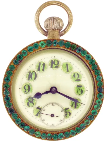 France, paperweight clock, ball form with green brilliant set bezel, Arabic numeral white enamel dial with green cartouches, blued steel hands, 15 jewel stem wind, pin set bar movement, c1900