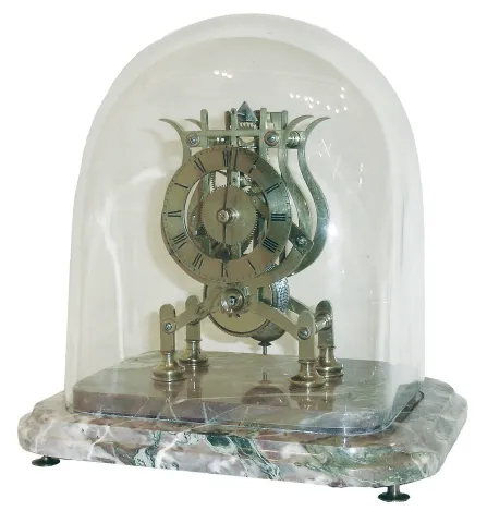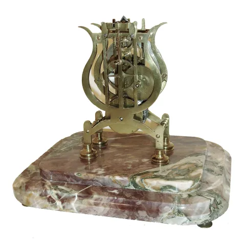 Skeleton clock, England, the, 8 days, fusee movement with pierced brass plates of lyre form, turned baluster pillars, recoil escapement, engraved Roman numeral brass dial with blued steel hands, all on turned feet and mounted to a stepped, varicolored marble base, with glass shade, c1850 movement good, running, escapement needs minor adjustment, dial lacking silver, hands may be old replacements, hour wheel replaced, marble base with a few tiny flakes, shade good, Ht 11Ò
