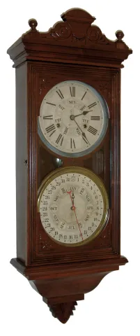 Jerome & Co. (New Haven Clock Co.), New Haven, Conn., ÓRegisterÒ wall hanging clock with spring driven, 8 days, time and strike, movement with perpetual calendar in a walnut case, c1880.