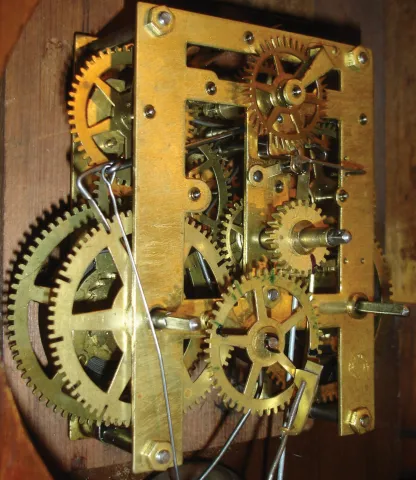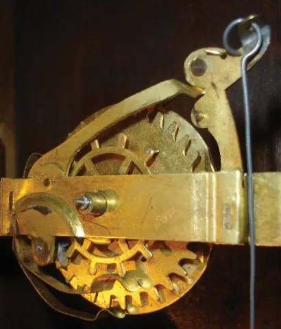The case is very nicely finished. The bottom finial appears replaced. The paper time dial is in good condition with period hands, The calendar paper dial is also in good condition with period hands. There is a small side door on the right side of the case that appears to be later, The movement is signed New Haven Clock Co. The door glass is original. Overall a very attractive clock. Ht 33 1/2Ó.
