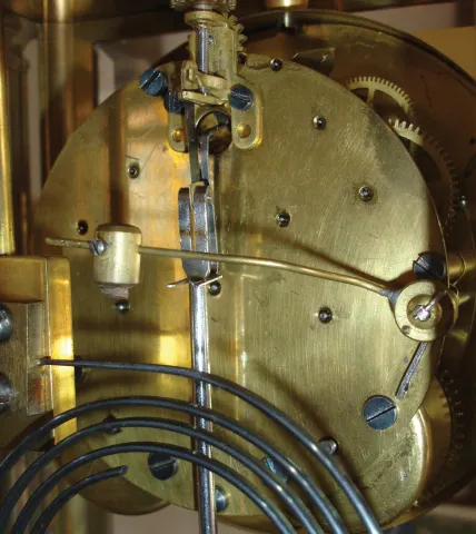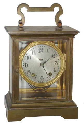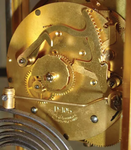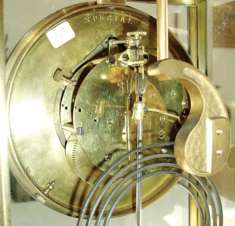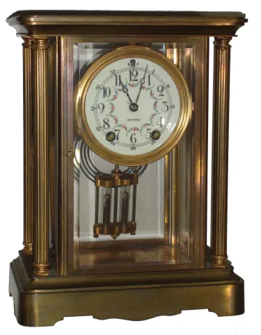 (1) this appears to be a larger taller version of the Empire No. 307 but is not shown in Ly or in our auction records. ÒSpecialÓ is stamped on the rear of the dial, so this may not be a production model. The lacquered brass has some minor tarnish, and two of the beveled glasses have corner chips. The silvered dial has small spots and scratches, and has applied bronze numbers. The simulated mercury pendulum has one broken glass vial. The clock ticks but does not strike, and the small gathering pallet is loose and bagged inside the case. Ht 15Ò; (2) the lacquered brass surfaces have darkened and tarnished, the beveled glasses are good. The signed multicolor enamel dial, with its floral garlands, is fine, as is the simulated mercury pendulum. The signed movement ticks and strikes, but not tested long term. Ht 12Ó (3) the lacquered brass surface has darkened and worn, the beveled glasses all are fine, the signed silvered dial is toned and scratched a bit. The movement ticks and strikes properly but was not tested long term. Ht to handle top 11Ò