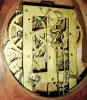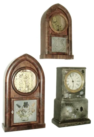 Clocks- 3 (Three): (1) E. C,. Brewster, Bristol, Conn. 8 days, time and strike, brass rack strike movement with detached fusees round gothic or beehive shelf clock, c1835. (2) Forestville Manufacturing Co. (J.C. Brown), Forestville, Conn., 30 hours, time and strike, miniature round gothic or beehive clock, c1845. (3) Unknown, Connecticut, 8 days, time and strike, brass movement painted case with MOP shelf clock, c1850 (1) Mahogany veneered case with some veneer loss on the base and some damage on the back edge of the top. Frosted tablet is a replacement. Movement is marked ÓNo. 5845Ò and parts of the ÓGenevaÒ stops on the movement are missing. Dial glass is broken. There is no dial, hands or pendulum. (2) Rosewood veneered case has lost most of its finish and has veneer loss on the base and repairs on the front molding. The upper half of the door may be a later replacement. The etched tablet is modern. The movement is signed. Nice label inside the case. There is no dial, hands, pendulum or gong. (3) Black painted wood case with MOP has some of the Mother-of-Pearl missing. Original painted dial with scattered areas of loss. Minute hand is a replacement.