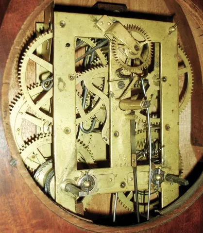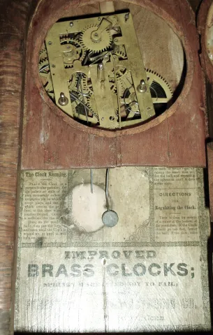 (1) Mahogany veneered case with some veneer loss on the base and some damage on the back edge of the top. Frosted tablet is a replacement. Movement is marked ÓNo. 5845Ò and parts of the ÓGenevaÒ stops on the movement are missing. Dial glass is broken. There is no dial, hands or pendulum. (2) Rosewood veneered case has lost most of its finish and has veneer loss on the base and repairs on the front molding. The upper half of the door may be a later replacement. The etched tablet is modern. The movement is signed. Nice label inside the case. There is no dial, hands, pendulum or gong. (3) Black painted wood case with MOP has some of the Mother-of-Pearl missing. Original painted dial with scattered areas of loss. Minute hand is a replacement.