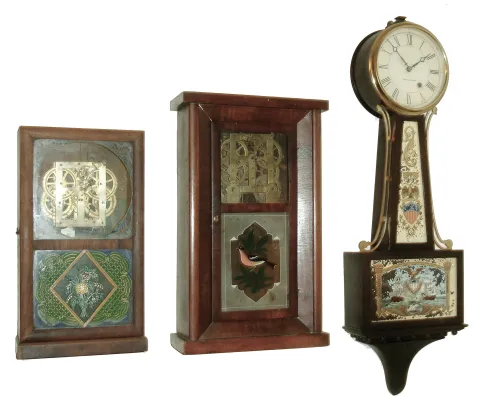 (1) The case retains its original finish. The painted dial is in good condition. The hands are original. The movement is signed and is the 41AL model. Both painted glasses have serious flaking. Ht 37 1/2 Ó. (2) The case retains some original finish. The dial, hands and striking gong are absent. The fusee mechanism is a, 30 hours, type while the brass movement is an, 8 days, movement. The support rails for mounting the movement are missing. Both door glasses are original with the lower New York-style glass with a colorful bird and in very good condition. Ht.19 3/4Ò. (3) The case retains some original finish. The dial, hands, fusee mechanism, pendulum and strike gong are absent. The upper and lower door glasses are original Fenn glasses with some loss. The movement is signed H. Welton. Ht 16 1/2Ó.