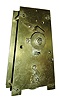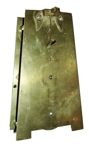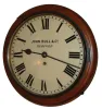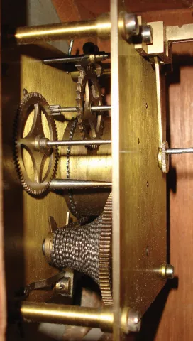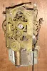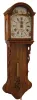 (1) Nicely made brass movement. From the number of teeth on the escape wheel this looks to be a long pendulum movement. There is no weight, dial or hands. (2) Cast brass access door and a thinner brass case in good condition with some small areas of light tarnish. Original painted dial with some very light scratches at the winding arbors. Hands are original. Ht 7Ò; (3) Mahogany case in an old finish in nice condition with shrinkage crack in the wood case at eleven oÕclock. Original painted dial signed ÓJohn Bull & Co., BedfordÒ in very nice condition with slight loss at the winding arbor. Bezel glass is missing. Original Hands. Quality made chain drive fusee movement. Ht 15Ó; (4) Painted frame with applied gold tone ornaments is in nice condition. Painting is very nice with some minor wear at the winding arbors. The dial has age darkened. Hands are missing. Ht 27Ò; (5) Oak case model with restoration. The sliding lower section may have been damaged or lost and a new nicely built replacement was made, but the wide grained oak that was used does not match rest of the case. The fancy pendulum aperture cover on the lower section is a modern cast copy. Although these covers were sometimes cast, most originals were pressed brass. Original painted dial is in good condition for its age. The minute hand is missing, but a repro is included. The alarm mechanism is intact, but pendulum is missing. The hood is missing a base molding that allows it to sit on the case molding and the hood door needs to be reglued. Ht 49Ó