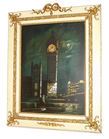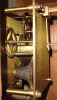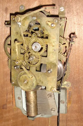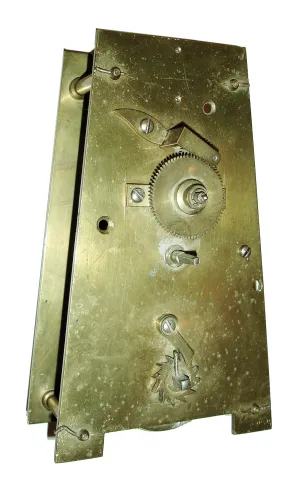 Clocks- 4 (Four) and a movement only: (1) English, 8 days, brass spring fusee regulator clock movement (only), c1900; (2) Aug. Schatz & Sohne, 8 days, time and shipÕs bell strike brass case wall clock, c1980; (3) English, 8 days, Time, brass spring fusee gallery timepiece, c1890; (4) English, 30 hours, balance escapement time (only) movement with music box. The picture depicts Parliament House, London, with the mechanism working the clock of Westminster (which strikes ÒBig BenÓ which is the name of the bell, not the clock), c1900. This example is a painted design a Masonite-type panel with applied mother-of-pearl. These pictures were sold as a souvenir to tourists. This is one is numbered: 4768. The small music box that ran off the strike train probably plays Westminster chimes; (5) Dutch, Startklok 30 hours, time, strike & alarm weight-driven hanging clock, often called a ÒtailÓ clock or Dutch Hood, c1830 (1) Nicely made brass movement. From the number of teeth on the escape wheel this looks to be a long pendulum movement. There is no weight, dial or hands. (2) Cast brass access door and a thinner brass case in good condition with some small areas of light tarnish. Original painted dial with some very light scratches at the winding arbors. Hands are original. Ht 7Ò; (3) Mahogany case in an old finish in nice condition with shrinkage crack in the wood case at eleven oÕclock. Original painted dial signed ÓJohn Bull & Co., BedfordÒ in very nice condition with slight loss at the winding arbor. Bezel glass is missing. Original Hands. Quality made chain drive fusee movement. Ht 15Ó; (4) Painted frame with applied gold tone ornaments is in nice condition. Painting is very nice with some minor wear at the winding arbors. The dial has age darkened. Hands are missing. Ht 27Ò; (5) Oak case model with restoration. The sliding lower section may have been damaged or lost and a new nicely built replacement was made, but the wide grained oak that was used does not match rest of the case. The fancy pendulum aperture cover on the lower section is a modern cast copy. Although these covers were sometimes cast, most originals were pressed brass. Original painted dial is in good condition for its age. The minute hand is missing, but a repro is included. The alarm mechanism is intact, but pendulum is missing. The hood is missing a base molding that allows it to sit on the case molding and the hood door needs to be reglued. Ht 49Ó