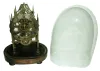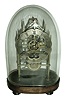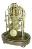 although the scalloped dial is nicely engraved with Roman Numerals, its silvering is worn to brass. The spired Gothic frame is light and delicate and the train wheels are finely made, even though only 4 spokes. The old dome is slightly large for the base; does not fit into the groove, however has nice proportions, and keeps the dust out. Overall, a hand made, pre-production era skeleton, sure to please the fastidious English collector. Ht of plates = 7.6Ò overall with dome and base = 11+Ó