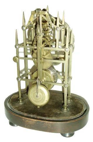 English, Whitehouse, Lichfield (signed on dial), small Gothic motif single fusee skeleton clock with dome, c1850 although the scalloped dial is nicely engraved with Roman Numerals, its silvering is worn to brass. The spired Gothic frame is light and delicate and the train wheels are finely made, even though only 4 spokes. The old dome is slightly large for the base; does not fit into the groove, however has nice proportions, and keeps the dust out. Overall, a hand made, pre-production era skeleton, sure to please the fastidious English collector. Ht of plates = 7.6Ò overall with dome and base = 11+Ó