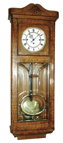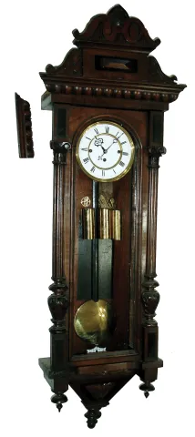 Clocks- 2 (Two) ÓRememberÒ German 3 weight walnut time and quarter striking wall clocks, c1900 the older model has its top crest and finials, but no front glass and one top side molding is detached. The later model is complete with nice burled wood and leaded beveled glass. Both movements have the ÓRememberÒ trademark and their pendulums; the older one has weights. Hts 52Ó and 37 1/2Ò
