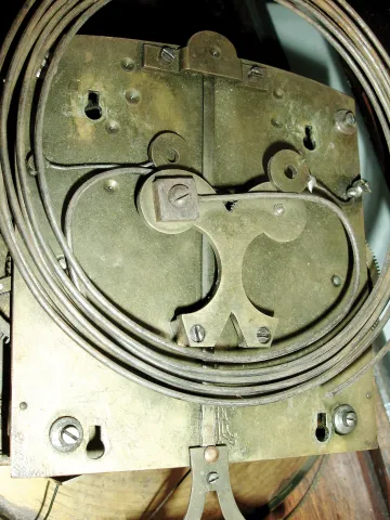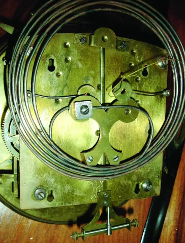 the older model has its top crest and finials, but no front glass and one top side molding is detached. The later model is complete with nice burled wood and leaded beveled glass. Both movements have the ÓRememberÒ trademark and their pendulums; the older one has weights. Hts 52Ó and 37 1/2Ò