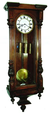 Clocks- 2 (Two) German walnut three weight, 8 days, Vienna regulators: one with Junghans trademark on back plate; one with Hermann Heinze on dial; c1890 ready for restoration, mostly complete with old finishes but missing glasses, a crest, movement mount posts, pulleys and one set of weights. White enamel dials are good, with some hairlines on one. Movements appear complete, with pendulums, but not tested and sold as is with no further details available. Hts. 43Ó each