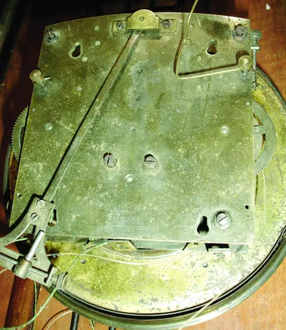 ready for restoration, mostly complete with old finishes but missing glasses, a crest, movement mount posts, pulleys and one set of weights. White enamel dials are good, with some hairlines on one. Movements appear complete, with pendulums, but not tested and sold as is with no further details available. Hts. 43Ó each