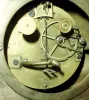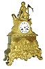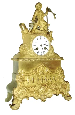 France, dore bronze figural clock, NAVY, showing a seaman going ashore with flag and axe, a giant bronze anchor at his feet, the clocked itself flanked by large striated waves of ocean, c1840 this clock [along with Army], came from a private collection in Arizona, and is in exceptional original condition. There are a couple of minor hairlines in the porcelain dial, but still very good. The well made silk suspension movement bears number 641, but is otherwise unsigned; strikes the hours and halves on a bell. Moon hands, pendulum, and misc hardware original. Ht 15 1/2Ò