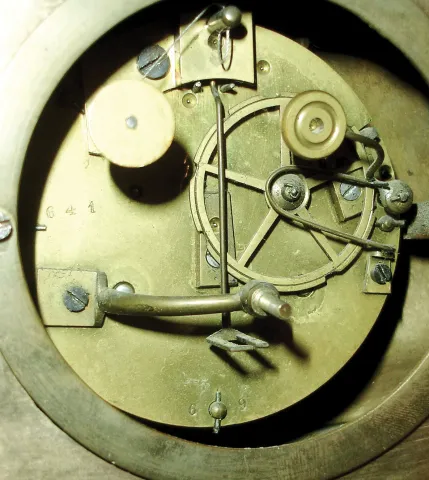 this clock [along with Army], came from a private collection in Arizona, and is in exceptional original condition. There are a couple of minor hairlines in the porcelain dial, but still very good. The well made silk suspension movement bears number 641, but is otherwise unsigned; strikes the hours and halves on a bell. Moon hands, pendulum, and misc hardware original. Ht 15 1/2Ò