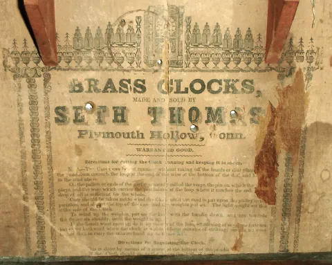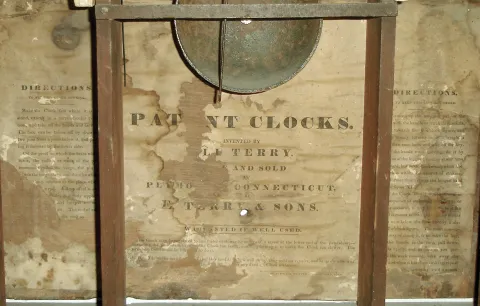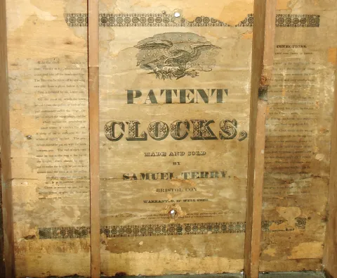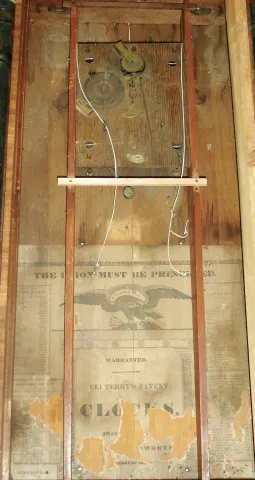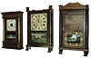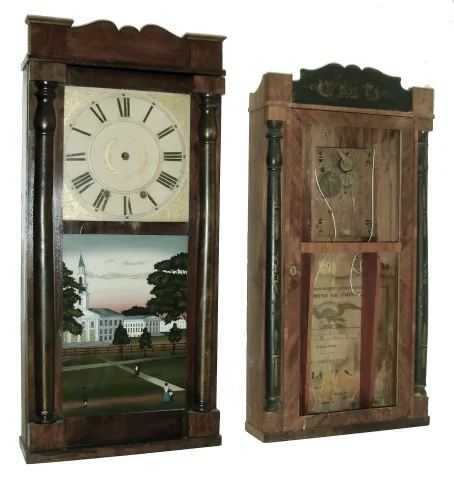 (1) Unknown. Half column case with evidence to suggest this case originally had a standard Terry type and is now fitted with a modern copy of a Torrington movement. There is no dial or hands. Tablet is modern. Cap is missing on one chimney. (2) Seth Thomas. Mahogany veneered case in original finish with minor loss. Original painted dial with some loss and poor repairs. Minute hand a replacement. Original tablet with loss. There are no weights. (3) Mark Leavenworth. Stripped mahogany veneered case with repairs. Half columns inside the case. One chimney cap missing. Both glasses, dial and hands are missing. One weight is missing. Late example with label recognizing Eli TerryÕs patent. (4) E. Terry & Sons. Mahogany veneered case in original finish. Top splat is missing. Dial is not original and the wrong size. Hands are original. Tablet is a replacement. Weights are missing. (5) Samuel Terry. Half column case in an old and possibly original finish. Movement is a replacement as it is an 8 days movement and does not fit the case. Good label, but for a 30-hour clock. The dial is original to the movement. Tablet is modern. There are no hands or weights.
