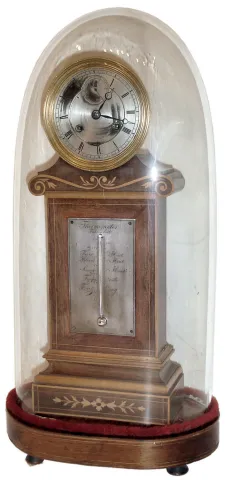 Case veneers with fading, one piece of molding missing at lower left, thermometer scale with some loss to silver, dial with losses to silver, hands good, movement ticks and strikes, bell stand repaired, base warped, some veneer lifting and with minor losses, dome good, clock case attached to base with adhesive foam strips, Ht 20Ò