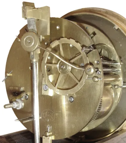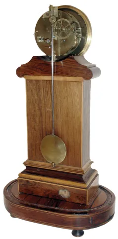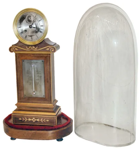 France, small mantel or table clock, rosewood veneered case with contrasting inlays and moldings, the front with thermometer mounted to an engraved silvered scale, gilt bezel with Roman numeral silvered dial, small seconds display at 12:00, blued steel Breguet style hands, 8 days, time and count wheel strike pendule a Paris movement signed ÒRobert a ParisÓ, dead beat escapement, rosewood veneered base on turned feet, with glass dome, c1840 Case veneers with fading, one piece of molding missing at lower left, thermometer scale with some loss to silver, dial with losses to silver, hands good, movement ticks and strikes, bell stand repaired, base warped, some veneer lifting and with minor losses, dome good, clock case attached to base with adhesive foam strips, Ht 20Ò