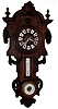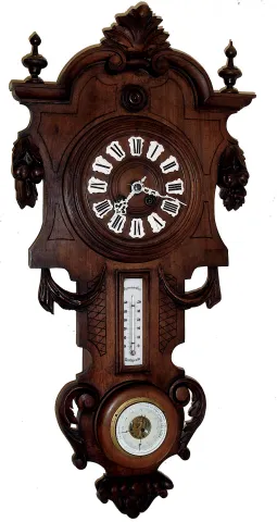 German, carved walnut, spring driven, wall clock with barometer, thermometer and white enamel numeral plaques, c1880