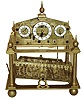 the brass is dulled but this novelty clock appears complete and will escape and advance when the lower platform rocks, although we have no ball to test. The coverÕs glasses are fine but one brass corner cover is missing. Ht of clock is 15 1/2Ò; enclosure with black base is 19Óx16Òx15Ó
