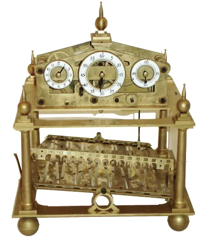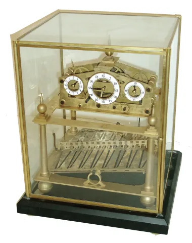 Congreve-style modern Asian brass unsigned reproduction rolling ball timepiece with glazed enclosure, late 20th century the brass is dulled but this novelty clock appears complete and will escape and advance when the lower platform rocks, although we have no ball to test. The coverÕs glasses are fine but one brass corner cover is missing. Ht of clock is 15 1/2Ò; enclosure with black base is 19Óx16Òx15Ó
