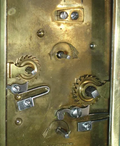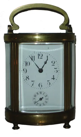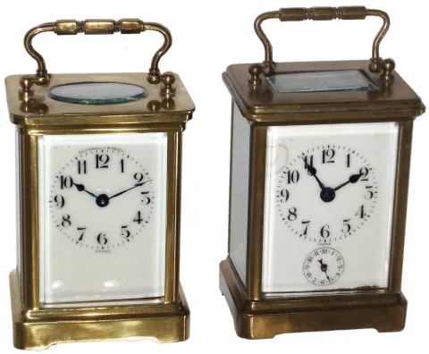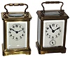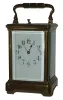 Clocks- 4 (Four) French carriage clocks, 8 days, brass and glass, early 20th century: (1), time only, by Duverdrey & Bloquel with rampant lion trademark; (2) time and alarm with rampant lion trademark; (3) Quarter Repeating, 8 days, time and strike, c1900