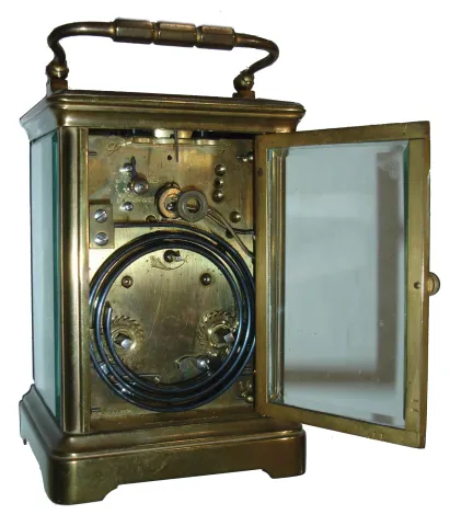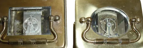 (1) the time-only has a freshly polished and lacquered case, a good signed enamel dial, and original 11-jewel balance platform, ticks. Ht to top of handle 5 1/2Ò (2) darker original surface, a damaged enamel dial, and a replacement platform, ticks. Ht to top of handle 5 1/2Ó; (3) the brass case is slightly tarnished but no damage or losses, the beveled glasses has a few minor corner chips, the white enamel dial is fine. The original balance platform ticks briskly, the striking may need minor adjustments but seems to repeat properly. Ht 6 1/2Ò; (4) the brass is tarnished but undamaged, the beveled glasses are fine except for two tiny edge chips. The white enamel dial has a faint hairline. The original balance platform ticks briskly. Ht to handle top 6 1/2Ó