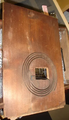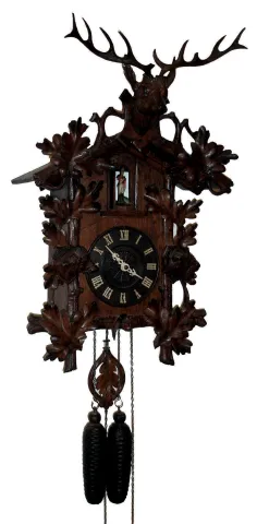 case looks to be made from some type of oak in a nice old finish. The deer and dog figures on the clock are very nicely done as well as the carved oak...