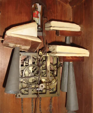 German, Black Forest, 30 hours, time and strike, weight brass movement three pipe trumpeter wall clock, c1885