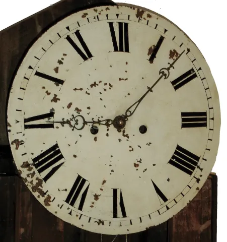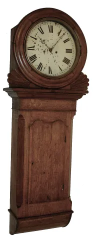 English tavern wall clock, 8 days, time and bell strike, weight driven movement in an oak case with painted metal dial, c1820 the case retains its original finish. The dial is period but not original to the movement and has loss. Hands are period, but not matching styles. Ht