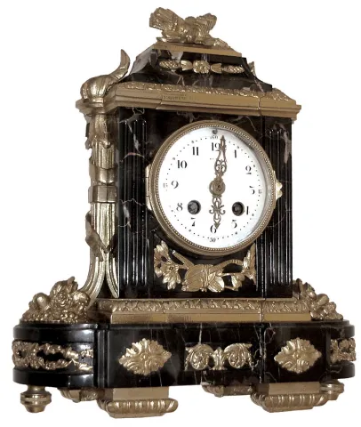 France, for Tiffany & Co., New York, small mantel clock, the Portoro marble case decorated with classically inspired gilt ornament, gilt bezel with deep convex glass, Arabic numeral white enamel dial, gilt hands with piercing and engraving, 8 days, time