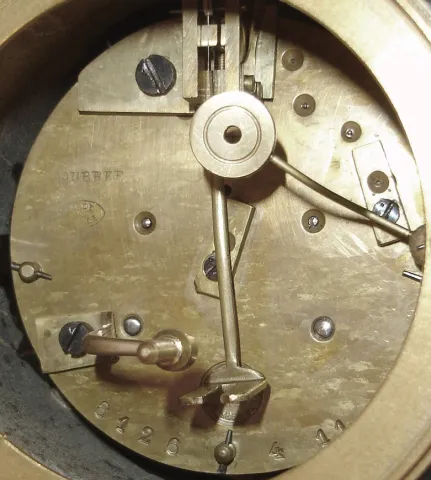 Case very good overall, mounts a bit dirty and with minor wear to gilding, glass and bezel good, dial with some loss to signature, hands good, movement ticks and strikes, bell and pendulum replaced, Ht 11Ò