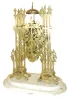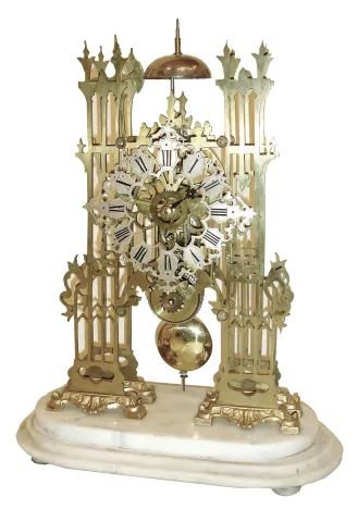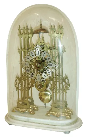 England, Skeleton clock, cathedral form pierced brass plates, Roman numeral, silvered pierced dial, fusee timepiece with passing strike, mounted to a white marble base, and with glass shade, c1860 plates good, a bit dirty, and with minor verdigris, minute hand broken, movement very dirty and oily, mainspring incorrectly set up, and so cannot be fully wound, ticks but isnÕt happy about it, marble dirty, feet reattached, shade with cracks, Ht 22 1/2Ò