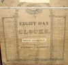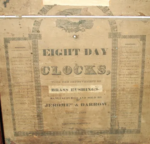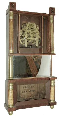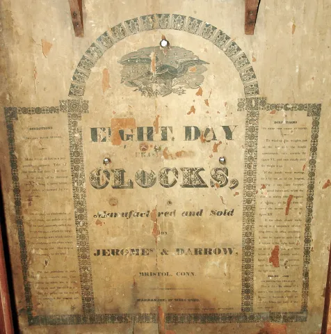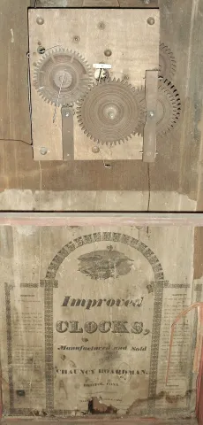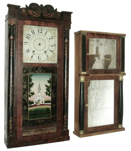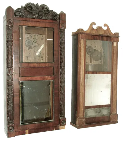(1) Chauncey Boardman mahogany veneered case with veneer loss on the right side. Carved capitals are missing. The top is a replacement created from old wood. Original tin bottom tablet has lost most of its paint. Mirror is period. There is no dial, hands, weights or pendulum. (2) Mahogany veneered case with losses on the bottom. Mirror is a replacement. The 30 hours, time, strike and alarm movement is not original as the case label states this was an, 8 days, clock. There is no dial, hands, weights, bell or pendulum. (3) Jeromes & Darrow. Mahogany veneered case with some veneer repairs on the base. Original stenciled columns and splat. Painted tablet is a replacement. Bottom glass is missing. Proper, 8 days, wood movement by Jeromes & Darrow, but came from a different case as this movement had an alarm that is now missing. The period dial fits the movement, but belongs to a movement without an alarm. There are no hands, weights or pendulum. (4) C. & L.C. Ives. Mahogany veneered case. Splat, upper door and one of the center columns are missing. Bottom door and the side pieces that hold the mirror are inside the case. Strap brass movement is probably not original has it does not fit into the slots in the case. There is no dial, hands, weights or pendulum. (5) Mahogany veneered case looks to be a Munger from the wallpaper lined interior. Period mirror and glass. There is no splat, hands, dial, movement, weights or pendulum.