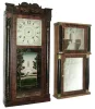 Clocks- 5 (Five): (1) Chauncey Boardman, Bristol, Conn., 30 hours, time and strike, weight wood movement Reeded Pilaster & Scroll top shelf clock, c128. (2) Jeromes & Darrow, Bristol, Conn., time and strike, weight wood movement carved column & splat