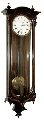 Vienna, Austria, single weight timepiece ÒVienna RegulatorÓ, unusual transitional grained case with oval glass in door. 8 days duration, c1860 Although a top trim appears to be replaced by only 2 finials, the clock is otherwise in very good original condition, with original movement intact. Retains one piece flat porcelain dial in excellent condition and with original hands. Brass pendulum bob is fine with no scratches nor dents. Movement is held in place on 4 brass posts attached to a brass backing. Ht 42Ò