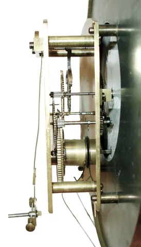 Although a top trim appears to be replaced by only 2 finials, the clock is otherwise in very good original condition, with original movement intact. Retains one piece flat porcelain dial in excellent condition and with original hands. Brass pendulum bob is fine with no scratches nor dents. Movement is held in place on 4 brass posts attached to a brass backing. Ht 42Ò