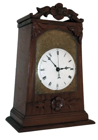 Chinese bracket clock, mahogany case with carved ornament, engraved brass dial surround, Roman numeral white enamel dial, 2 train, time and strike, movement