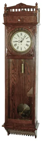 Waterbury Clock Co., Waterbury, Conn., jewelerÕs regulator wall clock, 8 days, time only, brass, weight driven, Waterbury No. 120 movement in an oak case with a painted metal dial, c1900