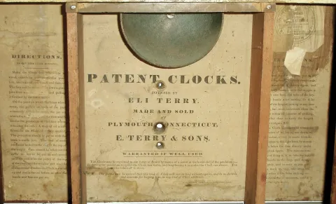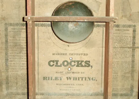 (1) Daniel Pratt. Mahogany veneered case with veneer damage on the base. Original painted dial has some paint loss on the bottom. Hands are original. Tablet is a replacement. Splat and left chimney are inside the case. Clean label inside the case. (2) Riley Whiting. Mahogany veneered case with original stenciling on the columns. A piece of the broken splat is inside the case. Left chimney cap is damaged. The case probably had feet. There is no dial, pendulum, weights or movement. (3) E. Terry & Sons. Mahogany veneered case with original stenciling on the columns. Original painted wood dial with scattered loss in the six oÕclock area. Original tablet with loss is cracked. There is no movement, weights or pendulum. There is evidence the case once had feet, now missing. (4) Bishop & Bradley. Carved columns with a unusual eagle splat. Backboard above the label is missing. Inside rails that support the movement are missing. Remains of original tablet. Included are two pineapple finials. There are no weights, pendulum, movement or dial. (5) Unknown. Carved columns and splat are very nicely done. Tablet is a replacement. Only a small piece of the label is all that remains. This case may have a spring movement as there are no pulleys to support a weight movement. There are no weights, pendulum, movement or dial.